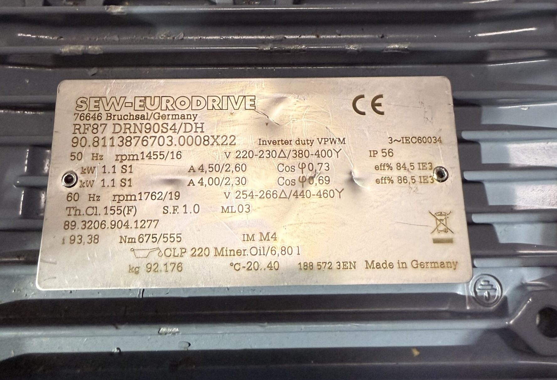 Motor + Gearbox - RF87 DRN90S4/DH - 1455/16RPM - 1.1kW